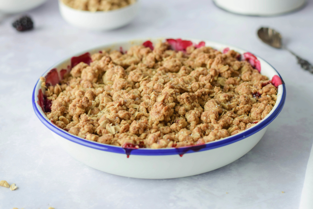 Mit den Streuseln bestreuen und für etwa 30 min im vorgeheizten Backofen backen. Mit Vanilleeis noch warm servieren.