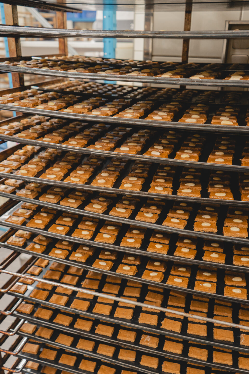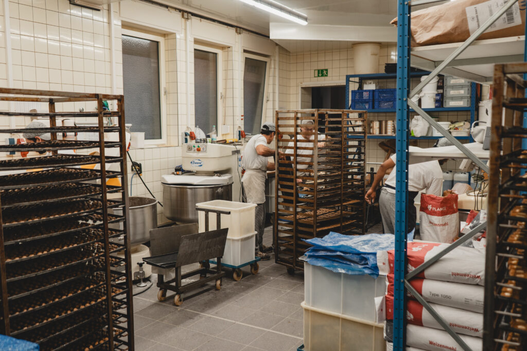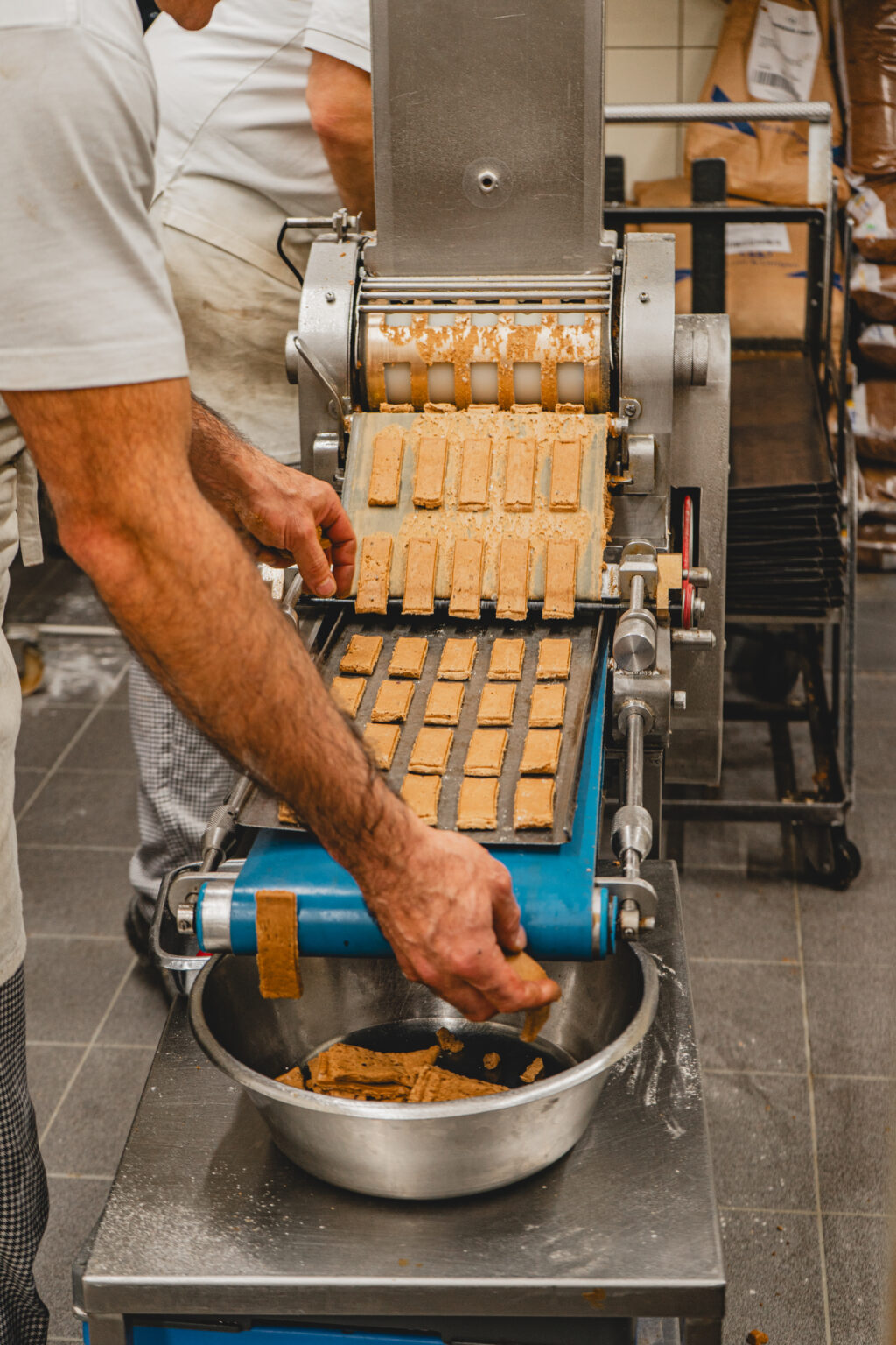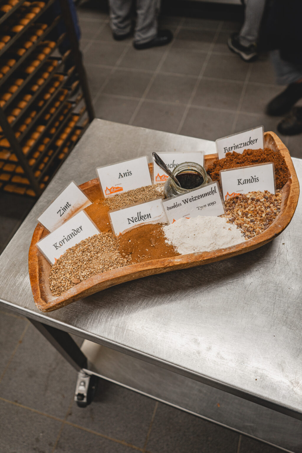 Die Bäckerei Klein, die heute ausschließlich Printen herstellt, gibt es schon seit 1912. Schon bevor ich das Gebäude betrat, konnte ich schon von draußen den warmen Duft nach gebackenen Gewürzen und dunklem Zucker riechen. Zunächst durfte ich mir einen kleinen Vorraum anschauen, welcher zum verpacken der vielen Printen dient. Man hat das Gefühl in der Zeit zurück gereist zu sein, rustikale Holz Täfelungen , eine alte, über die Zeit gelblich gewordene Uhr an der Wand und überall alte Papiere, dazu eine Vielzahl von Holzformen an der Wand. Auch wenn es nur ein kleiner Vorraum war, hat man dort die lange Geschichte, die die Bäckerei klein mit sich bringt sofort gespürt (vielleicht war es für mich aber auch von nostalgischen Erinnerungen an die Werkbank meines Opas geprägt). Hier, konnte ich mir die Vielzahl von verschiedenen Printen anschauen, die hier hergestellt werden. Neben den klassischen Kräuter Printen, gab es auch mit Schokolade und Nüssen überzogene Weichprinten, kleines Printenkonfekt und was mich besonders begeistert hat: Printen Mehl, zu feinem Mehl zermahlene harte Kräuterprinten. Damit man noch leichter das Aachener Stadtgebäck in eigne Gebäcke und Saucen einarbeiten kann. Wie ich erfuhr, ist die Idee so entstanden, weil die Bäckerei einige Rezepte von Liebhabern ihrer Printen geschickt wurde und man es diesen einfacher machen wollte die Printen zu verarbeiten.