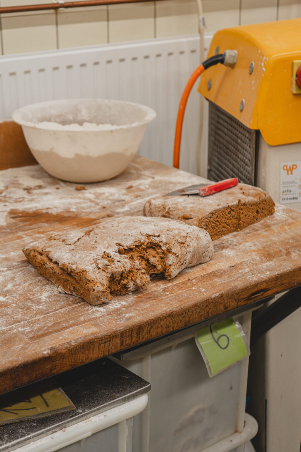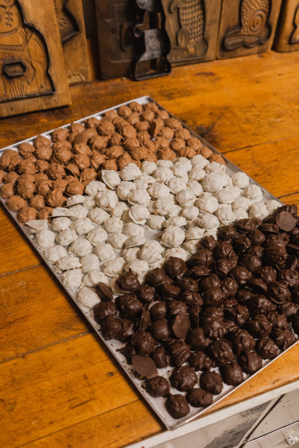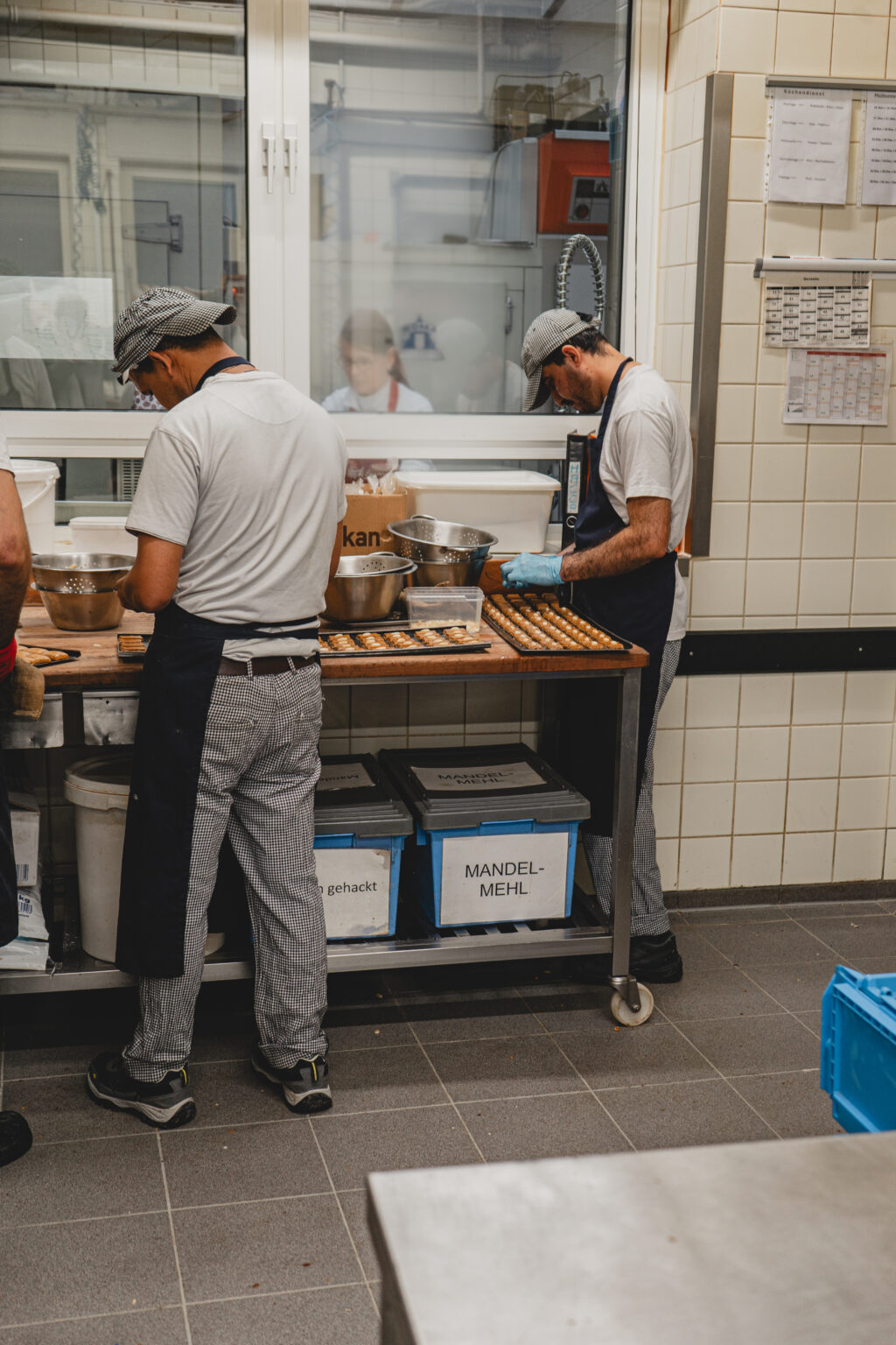 Die Bäckerei Klein, die heute ausschließlich Printen herstellt, gibt es schon seit 1912. Schon bevor ich das Gebäude betrat, konnte ich schon von draußen den warmen Duft nach gebackenen Gewürzen und dunklem Zucker riechen. Zunächst durfte ich mir einen kleinen Vorraum anschauen, welcher zum verpacken der vielen Printen dient. Man hat das Gefühl in der Zeit zurück gereist zu sein, rustikale Holz Täfelungen , eine alte, über die Zeit gelblich gewordene Uhr an der Wand und überall alte Papiere, dazu eine Vielzahl von Holzformen an der Wand. Auch wenn es nur ein kleiner Vorraum war, hat man dort die lange Geschichte, die die Bäckerei klein mit sich bringt sofort gespürt (vielleicht war es für mich aber auch von nostalgischen Erinnerungen an die Werkbank meines Opas geprägt). Hier, konnte ich mir die Vielzahl von verschiedenen Printen anschauen, die hier hergestellt werden. Neben den klassischen Kräuter Printen, gab es auch mit Schokolade und Nüssen überzogene Weichprinten, kleines Printenkonfekt und was mich besonders begeistert hat: Printen Mehl, zu feinem Mehl zermahlene harte Kräuterprinten. Damit man noch leichter das Aachener Stadtgebäck in eigne Gebäcke und Saucen einarbeiten kann. Wie ich erfuhr, ist die Idee so entstanden, weil die Bäckerei einige Rezepte von Liebhabern ihrer Printen geschickt wurde und man es diesen einfacher machen wollte die Printen zu verarbeiten.